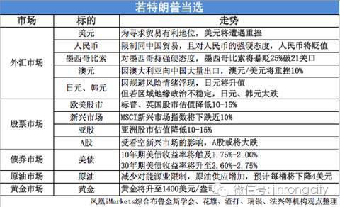 其他的亚洲指数也全线下跌,恒生指数下跌2.16%;韩国KOSPI下跌2.25%。 搞笑的是,随后的欧洲股市在午盘后开始收复失地,英国富时100收盘时涨了58.29点;德国DAX30指数上涨1.80%;法国CAC40指数上涨1.42%。 美国股市更是强劲,除了开盘时振幅较大之外,后续一直处于红盘之上,到收盘时,道琼斯工业平均指数涨了257.12点,涨幅达1.40%;纳斯达克也有1.11%的巨大涨幅。 再看看之前各路机构、砖家的对特朗普上台后金融市场的预测,你一定会笑掉大牙。 实际的情况是,一夜之间,美元指数、美股都大幅飙升。原来特朗普上台才是最大的利好!最大的利好!最大的利好! 特朗普当选并非黑天鹅事件 为什么会这样? 一开始,全球金融市场显然对特朗普入主北宫没有做好心理准备。或者说之前的一系列预测,误导了市场。 之前,全球市场一致看好希拉里。但当特朗普创造了奇迹后,金融市场将其称为是英国脱欧一样的黑天鹅事件,亚太股市就稀里哗啦。 而市场之所以不看好特朗普,是因为其政策上的相对不明朗,其上台对未来预期造成不稳定,避险心里突然增强。 概括起来,特朗普在施政方面,显得较为另类和激进。反映在移民政策、贸易政策、税收政策、金融监管政策上面都是如此。不过这是在竞选时表现出来的姿态。 移民政策方面,特朗普主张在墨西哥边境筑墙,迅速遣返非法移民,并且决不会让非法入移民成为美国公民。这一点得到了包括亚裔在内的移民的支持。 贸易政策方面,特朗普偏向贸易保护主义,提出对所有进口货物施加20%关税,特别是对中国和墨西哥征收45%关税,从TPP中撤出,甚至扬言退出WTO。 不过按照美国的体制,特朗普在贸易方面的政策不可能随心所欲,还必须受到两院的牵制。再说贸易关税是两败俱伤的事,务实的特朗普也不会轻易抛出不切实际的贸易措施。 外交方面,特朗普更加务实,其之前已经表示要和俄罗斯修好,而不是奥巴马时代的冷战对抗。 在特朗普明确成为下届美国总统后,普京大帝也第一个发去贺电。多及时!已经有了一点惺惺相惜的味道。 如此一来,接下来的一段时间,世界将会变得平和许多,有利于缓和美国和俄罗斯以及中国之间的紧张关系。 税收政策方面,特朗普也延续共和党的一贯主张,提议大幅减税,主张把现行个人所得税累计从7档简化为4档,最高税率33%;提倡废除遗产税;将企业所得税由35%降为15%;对企业迁回海外收入一次性征收10%税收,鼓励海外盈利汇回国内;富人受益最为明显。 在金融监管方面,与希拉里的政见完全相反,特朗普建议废除Dodd-Frank法案,重新审视现在的监管政策,放松银行借贷。对搞活金融市场是有很大帮助的。 估计对这一政策,华尔街也乐见其成。 难怪有传言称,美国幕后的大财团已经放弃了顽固的希拉里,转而支持特朗普。 在财政扩张方面,特朗普也支持通过扩大基建来刺激经济,而且刺激方案的规模高于希拉里的提议,他建议至少花费5500亿美元来重新建立美国的基建设施,认为有更多的桥需要重新修建。 简而言之,特朗普的上台,有利于全球获得平和的政治环境,有利于美国经济的复苏,并带动全球经济重拾增长信心。 对中国更是利好! 特朗普当选美国总统,首先在南海问题上双方更容易获得谅解。特朗普在地缘政治上主张采取收缩战略,与俄罗斯很可能和解,重返亚太也将低调收缩。这保证短时间内双方不会有大的军事摩擦。 而在韩国部署萨德导弹问题上,中美双方也可能在特朗普上台后谋求新的妥协结果。 其次,特朗普不主张美元加息,希望低利率的金融环境。所以令全球提心吊胆的12月美元加息事件可能无疾而终。缓解包括中国在内的新兴经济体的美元回流风险。 三是,在外交政策上,特朗普建议将中国列为汇率操纵国,对中国的贸易加大执法力度,给美国创造更多就业岗位,这可能加剧与中国的贸易摩擦和冲突。 这可能会是个风险点,不过贸易摩擦都是伴随双方两败俱伤的结局。同时,美国民众也不愿意牺牲当前的消费水平转而支持对中国商品增加关税。特朗普在贸易保护方面的政策市有限的。 同时,汇率战争也不可能那么容易打响。中国已经在人民币均衡汇率方面做了很多努力,这一点特朗普政府不会不考虑。尽管特朗普上台,人民币有贬值压力,但同时人民币贬值有利于提升中国外贸竞争力。另外特朗普主张美元收缩,让更多的美元流回美国,这恰恰是给人民币国际化带来契机。 四是,特朗普主张优先发展美国经济,美国将重新成为世界经济发展的引擎,这让处于转型中的中国经济获得喘息机会。 此外,作为一个商人,特朗普政府很可能不会在人权问题上对中国过度发难。他曾经说:“我爱中国。世界上最大的银行来自中国”,并特别指出中国银行的美国总部就设立在特朗普大厦中。 特朗普在获胜演讲中称:美国人是时候团结一致弥合分歧;向每位市民保证将是每个人的总统;希望用自己的商业经验帮助美国发展;之前被忽视的美国民众将不再被忽视;我们将重新修建城市和基础设施; 我们将照顾好我们伟大的退役士兵; 美国将得到最好的发展; 向全世界声明,我们将公平对待每一个人;将在世界上寻求合作而非冲突;我们将为国家的发展而努力;我们将致力于全国性的增长和重建项目;我们拥有伟大的经济计划,我们将使美国经济增长翻倍并打造出最强大的经济。 看看他的观点,或许,特朗普的当选,对全球来说才