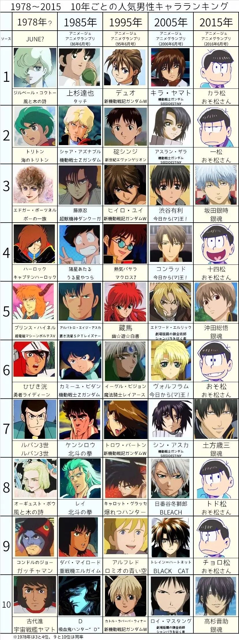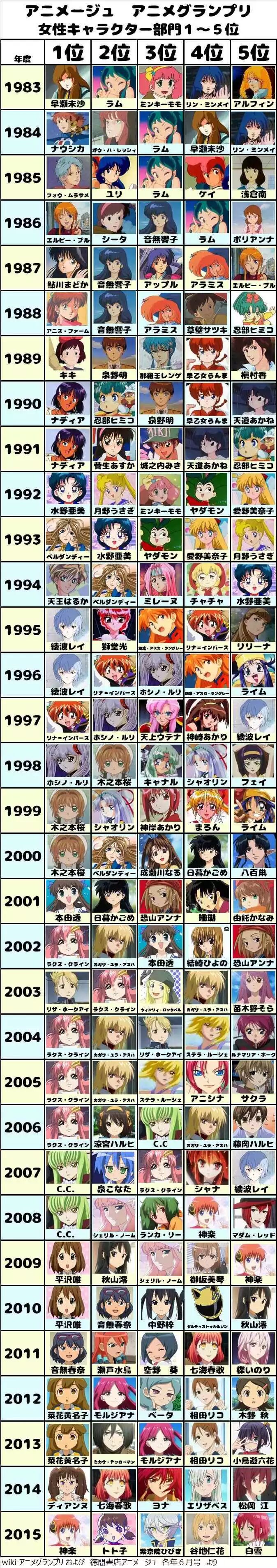 首先看一下人气动画男性角色排名,截取的是《Animage》每隔10年的人气男性角色变迁表。该表格列出的是1978年至2015年间,每隔10年的《Animage》6月号的男性角色人气投票排名前10名。 (ps:由于截取年份相隔较远,很多作品没上榜,可能略有偏差哈~) 没看过《阿松》的小伙伴们,在看到2015年的排名时,大概只能保持懵逼状态了……不知道再过个几年,新一代追番小伙伴看到这个榜单时会是什么想法? 然后人气动画女性角色排名展示的为,德间书店出版的日本三大动漫杂志之一《Animage》的人气女性角色变迁表。该表列出的是1983年至2015年间《Animage》6月号中的女性角色人气投票排名前5名。 最后是角川公司出版的日本三大动漫杂志之一《NEWTYPE》的人气女性角色变迁表。该表格列出的是2011年至2016年间《NEWTYPE》评选出的年度人气女性角色前5名。 一路看下来不仅能够看到每个年代大家的喜好,还可以看到故事题材、画风等的变化,你还停留在哪一年呢? (ps:由于每本杂志的排名榜单都很多,评选结果也有所不同,仅选取了部分代表,可能会有偏差值) 图by:微博@日_推 复制这条信息,打开手机淘宝即可看到【【正版周边】海贼王 一番赏各种杯子玻璃杯 日版金猫 限量版】¥AAbTRHHb¥https://e22a.com/h.YErynH?cv=AAbTRHHb&sm=cecfd7 点击左下方“阅读原文”就可以! | |