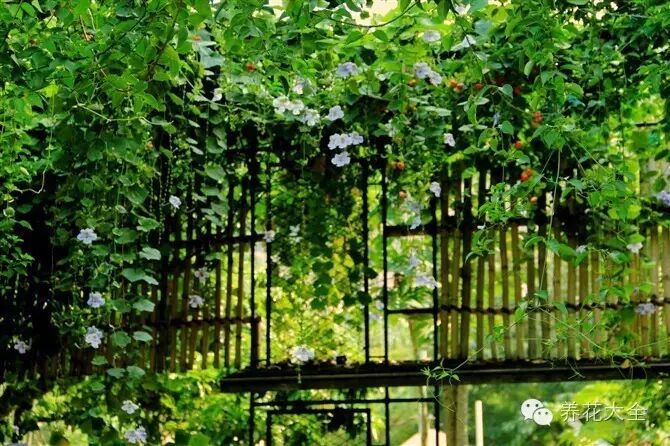 不知道你们是不是和花花一样,都希望经过自己的劳动,有个爬满花的院墙,有个姹紫嫣红的花廊,夜晚坐在花下赏赏月,白天坐在花下晒太阳,这种生活,给多少钱都不愿意换! 1.黑眼苏珊 淡黄色的花,光是颜色就让人惊艳,再让她爬上墙头,挂在阳台,扶上栏杆,估计所有的花都要为之失色了吧! 养护要点: 1.秋天的时候播种或者扦插。 2.高15厘米左右需摘心,促进分枝。 3.耐热性不好,最高温度不超过30度。 2.蔓性风铃花 这是挂在枝头的小灯笼?看错了,这是蔓性风铃花,红彤彤的挂在枝头,整个院子都红火了起来! 养护要点: 1.阳光要充足,每天至少接受4个小时左右阳光直射。 2.盆土表面大概1厘米左右干了,就要浇水了,但不可积水。 3.喜温暖,适宜生长环境的温度在10度以上。 4.幼苗时进行摘心,让她多分枝开花。 3.铁线莲 铁线莲被誉为“藤本花卉皇后”,是很多园艺达人的装饰首选,花色多样,花形小而精致,簇拥起来,满园芳香,牛人们常常把她和月季搭配起来装点阳台、庭院。 养护要点: 1.盆土排水、透气性要好,保持盆土湿润,忌积水。 2.选择较大的花盆来种植铁线莲。 3.春秋冬可以接受全光照,过冬零上8度即可,夏季根部要遮阴。 3.对嫩芽及时牵引,用铁丝进行横向牵引。 4.冬美人 大神的冬美人不想禁锢在小小的花盆里,从墙内爬到了墙外,每一个繁茂的枝头都倾注了养肉人的心血,这样的冬美人,花花也想来一个! 养护要点: 1.土壤排水、透气性要好,要有充足的阳光,夏天也可以接受全日照。 2.不能一直在叶芯处浇水,会导致积水烂根,耐旱,浇水次数要少,盆土干了再浇水。 5.旱金莲 一盆旱金莲,一不小心就爬满了院子的墙头,缠上了阳台的栏杆,冬开不断,过路的人可是大饱眼福了一把。 一株旱金莲可以开出几十朵花,叶似碗莲,花似蝴蝶,恰似一只只蝴蝶盘旋在碗莲上迎风起舞,香气扑鼻,橘红的、紫红的、乳黄的……热闹极了! 养护要点: 1.南方的花友可以全年种,北方室外要开春后再种,窗台、阳台、庭院都可以种植。 2.盆土要疏松、透气性好,喜光,夏季要注意遮阴。 3.想让她多开花,就要将小苗的顶苗掐掉,再施肥,距离盆面15厘米左右,按自己的喜好搭架子, 6.绣球荚蒾 与一般的绣球不同,绣球荚蒾花只有纯洁的白色,庭院里种上,彰显着主人高洁的品质,你说爱不爱? 养护要点: 1.喜光,耐阴,盆栽需要再室内5度以上过冬。掐个嫩枝就可以活,最好是初夏。 2.4-5月份开花,花谢后要将枝条剪短,可以促进新的枝条生出。 6 7.大花老鸦嘴 仔细看花是不是像乌鸦的嘴,花名也由此而来,有些俗气,其实人家长得挺文艺的,浅蓝色的花,简单垂挂下来的花蔓,如果自家院墙上、栏杆上挂满了,真是再贵再好的珠帘也不羡慕! 捧个茶杯,坐在花下晒个太阳,这是花花最喜欢的生活状态了! 养护要点: 1.春天掐根枝扦插很容易生根,雨季再进行定植,盆栽要用支架栽培或者直接吊起来养。 2.喜温暖湿润,阳光要充足,秋天花开后,要进行修剪。 8.电灯花 一朵朵挂下来,像不像小电灯泡啊,搭个架子悬挂起来,还以为头顶上空满是电灯呢,挺有趣!花有淡淡的清香,最初开时是绿紫色,慢慢的就变成了紫色,一株花当两株赏,值! 养护要点: 1.不喜阳光直射,潮湿、土壤肥沃、排水好的环境适合种植,南方种植较多。 2.春天的时候可以播种也可以扦插。 9.八仙花 也叫绣球花,花友们可能并不陌生,每见一回爱的更深,花形美,颜色多,每一枝都被繁多的花压低了头,唯一遗憾的是,还缺个院子,种满绣球! 养护要点: 1.冬天露地栽培的要填土保暖,盆栽的要放在南面暖和的地方。 2.春天盆栽的可以修剪枯枝,换土翻盆,然后再施两次稀薄液肥。 3.夏秋盆栽要注意庇荫,盆土保持湿润即可。 10.牵牛花 花花更乐意叫她喇叭花,满满的都是童年的味道!别看她小小个,生命力顽强的很,蓝的、紫的、红的…在田间路边迎朝阳而开。一不小心就花团锦簇,让阳台、墙头、院子里…满是姹紫嫣红。 养护要点: 1.牵牛花非常好养活,把收来的种子种起来就可以了,4月份播种最好。 2.想要让牵牛花枝繁叶茂,就要经常摘心,只要侧枝长出了4片叶子,就要进行摘心,这就是养花达人养牵牛的秘诀了。 3.牵牛花长到一定的高度就可以做造型了,按照自己的喜好支架子,让牵牛顺着架子爬,或者放在护栏旁边。 坐在花下, 闻着花香, 品着清茶, 这就是养花人最大的乐趣! 公众号转载请在开头注明 [本公众号名称、ID、二维码] 否则按侵权处理 公众号对话模式下调戏我,给你好看 回复:植物名称(如发财树):查看养殖方法! 回复:1:80款世界最美菊花,不看后悔终生! 回复:2:9种花掐根枝就能活,不用管就爆盆! 回复:3:这10种花现在不剪,明年没花赏! 回复:4:冬天一盆水浇不好,你的花就死了! 回复:5:吊兰绿萝文竹10年不黄叶,咋养的? 商务合作、投稿请加QQ:1273160598 养花难题咨询,请加个人微信:yanghuadq | |