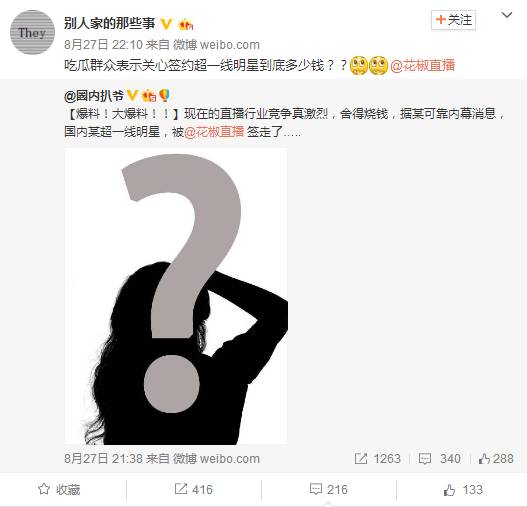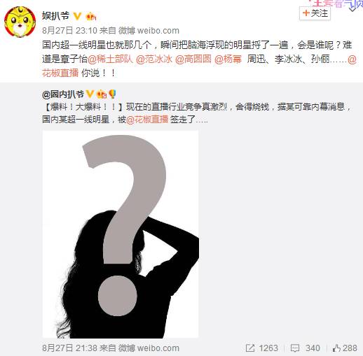 最近娱乐圈风声不断 原本以为 围观群众将迎来一个平静的周末 一条消息的爆出 再次让网友和明星的心连在了一起 某超一线明星 被花椒直播签走了! 消息一出 引发了网友们强烈围观 花椒签约了哪位国内超一线明星? 就在不明真相的吃瓜群众们 纷纷表示围观的时候 更多大号也纷纷转发了这则消息 现在的直播平台异常火爆 以目前花椒直播的综合实力 能够签约的 不必说也一定是位大牌明星 宝宝们是不是也在好奇 这位超一线明星究竟会是谁??? 我们不妨先分析下和花椒关联比较大的明星 柳岩 以性感著称的柳岩 被网友爆出曾花椒进行了VR直播 还亲手给工作人员喂吃的!! 羡煞150万围观直播的宅男 如此实力圈粉 难道是她? 高圆圆 高圆圆也曾通过花椒直播与粉丝进行互动 那次活动 在直播平台上收割了超过500万的观看人数 高女神如此人气 又或者是她?? 章子怡 既然花椒签约的是超一线明星 也有人猜测是不是章子怡? 国际章生了宝宝后已经复出 甚至在外出工作的时候还会用直播看看女儿 当真是直播狂热爱好者 说不定也想通过直播的方式 增加与粉丝的互动 国际章辣么美 难道已经被花椒直播纳入旗下 ?? 奥运明星 奥运会期间各大直播平台 也都使劲浑身解数邀请奥运明星助阵 而在这场直播“战役”中 最成功的无疑是花椒直播! 奥运明星张继科在花椒直播期间 瞬间涌入大量粉丝 花椒直播成热搜词并登上微博热搜榜 怒刷一大波存在感! 还同时霸占了 App Store社交免费榜和免费总榜前列 越来越多的体育、娱乐明星在花椒直播 以本届奥运会为例 花椒直播就推出多款优质内容 不光有苏炳添、张继科等明星 更有韩乔生、马健等体坛名嘴入驻 打造移动直播时代奥运新体验 搞得大家都来花椒直播 看老公 or 认丈母娘 这些体育健儿为国争光后 难道转型做主播了? 罗玉凤 就连凤姐也入驻花椒直播 在美国开启了自己的直播首秀 瞬间引爆全网 获得几十万关注量 不愧是网红前辈 凤姐这么火 不会是她吧? ? 想想自己爱的明星辣么多 也难怪大家会好奇 花椒这次签约的超一线明星会是谁? 有人说 博客时代有徐静蕾 微博时代有姚晨 那么 谁是明星直播时代的王者呢? 花椒的这位神秘明星说不定就是下一位哦~ | |