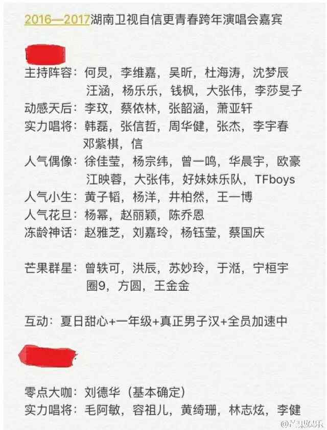 所以各个卫视的跨年晚会、春节晚会什么的也要准备起来了…… 掌柜在网上看到了一份芒果台跨年晚会的嘉宾名单,芒果台虽然经常被吐槽,但是地位还是不容置疑的。 每年的跨年晚会请来的也都是最热最红的明星,在一众千编一律的晚会里算是比较有看点了,所以今年又要请哪些明星呢?一起来看一下吧…… 阵容确实很强啊,看看人气小生,井柏然、杨洋、黄子韬和王一博确实都是当红的小生,粉丝很多,很受欢迎 人气花旦竟然集齐了杨幂、赵丽颖和陈乔恩,掌柜表示都很喜欢啊…… 几个比较老牌的明星刘嘉玲、赵雅芝、杨钰莹、蔡国庆咖位也都很大,说不定刘嘉玲现场还跟梁朝伟来个连线什么的,还能顺便看到影帝 还有当红的TFBOYS、邓紫棋、蔡依林、张韶涵、好妹妹都请来了……掌柜对这个阵容还是比较满意的! 不过看了嘉宾整容可以发现,基本上都是从芒果台的综艺里出来的呢,《我们来了》、《真正男子汉》《花儿与少年》还有《爸爸去哪儿》,所以芒果台和这些艺人应该都是合作关系,请来应该不成问题吧…… 不过大致看完这个名单大家有没有发现有点问题呢? 主持人阵容里,“快乐家族”四个唯独少了谢娜?看这个主持人分配,应该还是像以往一样分成两队比赛吧。 第一队里都是“快乐家族”的成员却唯独少了谢娜,而是换成了沈梦辰……这是要搞事啊?要代替娜姐的节奏? 看来《真正男子汉》发现沈梦辰这妹子也挺不错,猜到了晚会主持肯定有她,但是没有谢娜,掌柜真的没想到啊…… 虽然今年的元宵喜乐会主持里也没有谢娜,但是吴昕也没有参与,而是换成了李莎昱子和沈梦辰。这个阵容掌柜可以理解成是捧新人,但是跨年晚会为什么只有吴昕却没有谢娜呢? 娜姐曾经在某项综艺里说湖南台其实一直就把她当绿叶,很多时候其实是不信任的 看了这段话掌柜其实还挺心疼的,谢娜的主持风格一直都受到争议,但是喜欢的人确实很喜欢啊。 从一个空降小主持爬到一姐的位置,谢娜的这么多年绝对不容易!掌柜记得谢娜曾经说过女人不能软要坚强,一切靠自己。 这句话真的是real心疼啊…… 娜姐也说过不会离开湖南卫视,除非赶她走…… 不管怎么样都支持娜姐啊,小时候的快乐都是《大本营》给的,现在还有不开心就看大本营的习惯,无论怎么说都不希望娜姐离开《大本营》 | |