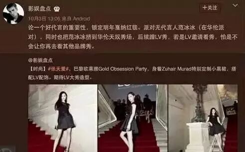 今天看到了欧莱雅的梦之队最新宣传照,你们感受一下。 从左至右分别是太子妃张天爱、巩皇、超模雎晓雯以及顶级超模Barbara Palvin(芭芭拉·帕尔文)。啧了个啧!第一眼竟然把张天爱看成了倪妮,最后还是从太子妃的霸道坐姿才认出的。娱乐圈,论资源我就服国际甜和太子妃。 一年前,张天爱才因为一部网剧《太子妃升职记》爆红,在那之前还是娱乐圈十八线小透明。结果才用了一年的时间,张天爱就从网剧咖飞升到和巩皇同框的咖位了。要知道,以资源强大著称的国际甜也是欧莱雅的某产品代言人,都没站进这张同框…… 而在之前,张天爱就已经征战过巴黎时装周了,只差直接说艳压了。 让人不禁想知道,张天爱到底什么来头?!张天爱的资源强可不止体现在时尚资源上。前不久,张天爱在微博上放出了《妖猫传》的定妆照。 虽然不是女一,但是戏份应该仅次于张雨绮了吧。而且是大电影啊,导演还是陈凯歌啊!这么多年,上过陈凯歌电影的女演员掰着指头就数过来了吧。 虽然说这部电影不是女一,但是网剧《武动乾坤》是绝绝对对的女一啊。虽说是网剧,但此网剧可不同于太子妃,男主是杨洋就不说了,导演可是张黎。张黎什么人啊,随便列举几个他导演的电视剧好了:《走向共和》《大明王朝1566》《人间正道是沧桑》……他摄影的电影都是大电影啊,《一声叹息》《大腕》《天下无贼》《夜宴》《赤壁》…… 为什么说张天爱是《武动乾坤》是绝绝对对的女一,简单来说之前定的是简单来说就是张天爱原定出演绫清竹,结果该剧微博正式官宣时张天爱变成了另一个女主角应欢欢,原来被传在阵容里的金晨出局。 然而在《舞动乾坤》开机当天,金晨还发了一条虽然没有指名道姓,但意思也很明显了的微博。 网络上张天爱截胡金晨的说法甚嚣尘上了。第二天张天爱就发个正式声明,核心内容是与片方一开始签的合约就是饰演女一号,要对肆意抹黑和造谣的营销号追责。 港真,剧组调整演员阵容很稀松平常的事情,演员们各凭本事各拼资源,本没什么了不起的,但是声明里说合约规定饰演女一号就显得有点儿怪怪的。给人感觉作为一个演员,要的不是角色,而是番位。 嗯,站金晨的吃瓜群众还把张天爱叫“截胡精”,还八出了张天爱疑似抢了赵丽颖广告资源的老料。这件事情简单说来就是,赵丽颖之前官方公布了行程,今年的10月8、9号要在无锡拍摄广告。 但之后,赵丽颖的这个广告行程取消了。而张天爱和杨洋和10月9日在无锡为某电商品牌拍摄了广告,上演了一出穿越爱情故事,是不是有点儿赶巧啊。 时间点上巧合也就算了,还被闲得蛋疼的网友八出前后两个招替身演员的信息,男演员没变,女演员从赵丽颖变成了张天爱…… 总结:拼抢资源都是各凭本事啦,最后谁把资源拿到手里了算谁牛。只是,小爱能不能别卖总共人设了,每次都撇着腿拍照好重复自己哦,可以解锁一下新姿势呀。 “我敢为刘若英留下成都的银杏黄”征集活动结果出来了,票数最高的两位分别是疯不觉和王圆圆爱喝汤,两位朋友将分别获得刘若英2016“我敢”成都演唱会门票一张! ———— · 谈资福利分割线 · ———— 只有看清了生命的终点,才能更好的活在当下 所以我们如此期待 期待生命中的一切 甚至是死亡 关注公众号“谈资” 发送消息到谈资:姓名+对话生命+电话号码 前10名获得“金士杰、卜学亮见面会入场资格” 获奖用户在下周二之前将收到工作人员给你发的入场通知短信 | 时间 | 2016年12月1日15:00 | 地点 | 方所成都店 成都市锦江区中纱帽街8号成都远洋太古里M68-70号 谈资带你每天吹牛B 大榜带你成都玩嗨皮 | |