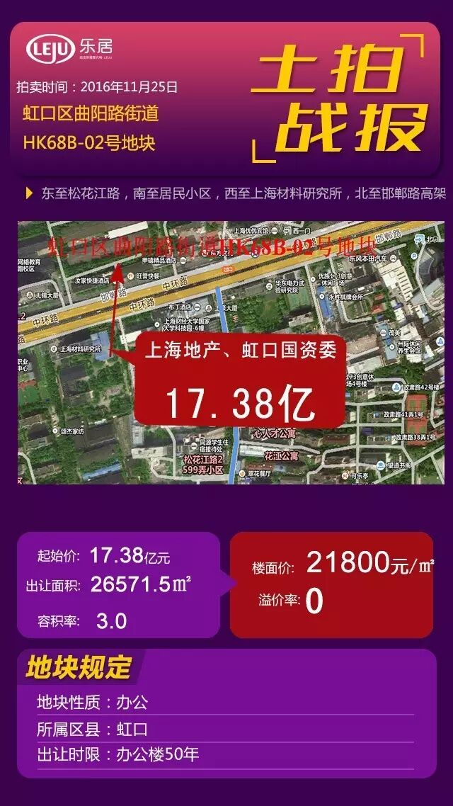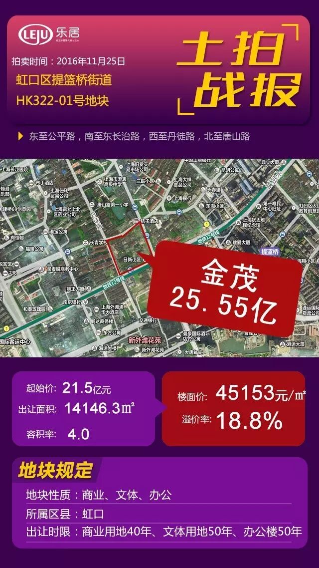 据媒体报道,虹口区提篮桥街道在此之前共出让过3宗商办用地,总成交价达60.4亿元。