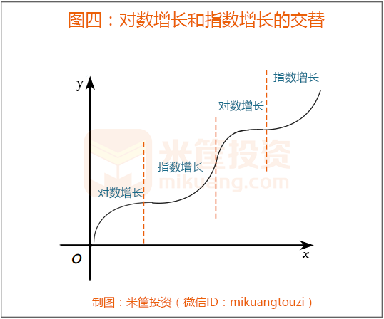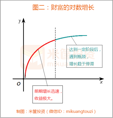 我们先来了解两个函数——对数函数和指数函数,其走势如下图: 左边的是对数函数,其反应的现象是:在初始阶段,Y的涨幅很大,可到了一定阶段后,Y的涨幅很小,趋近于零。如果把X看作时间、Y看作收益的话,可以简单的理解为, 当你做某件事情,在刚开始的一段时间内,收获很多,可到一定阶段后开始遇到瓶颈,其收益的增幅在变小,甚至没有。 如果举生活中的例子,比如体育运动、学生成绩的提高、普通工作的工资收入等都是如此。在体育运动中,刚开始的收益很大——技能提高、体能提升等,但到一定阶段后再上升就变得很难;小学生的科目成绩从零分提高到60分很容易,可从90分要提高到100分却十分困难; 工资收入更是如此,你只要工作就会立马有一份收入,跟之前的零收入相比,增幅很大,可一旦按部就班的进入工作,工资收入的增长则变得非常有限,好的话跑赢通胀,尤其是那种简单重复的工作更是如此。由于此篇文章侧重投资理财,这种现象也就是经济学中的边际效应(收益)递减规律的具体体现。 图中右边是指数函数,其反应的现象正好与对数函数相反: 在初始阶段其收益很小,可随着时间的推移,一旦突破某个临界点,其增长就犹如核裂变似的爆发出来。 我们同样可以举生活中的很多例子:科技研发、规模效应等。研发创新一向都比较艰难,前期需要耐得住寂寞和时间的煎熬,却几乎没啥回报,可一旦出成果,其收益便会爆发,获取巨大收益,“一举成名天下闻”; 规模的聚集效应同样如此,刚开始增长缓慢,一旦达到临界点,规模的协同效应出现,回报很难小觑,资本的投资回报即是如此——只有达到一定的规模才能资产配置、风险对冲、在保证固定收益的同时又能博取超高的风险溢价。指数函数反映的是量变引起质变的原理——积沙成塔、集腋成裘。 2、有瓶颈的劳动性收入,典型的对数增长 生活中对数增长的活动很多,劳动性的工资收入即是其一。 这种现象有目共睹,甚至不少人还感同身受,刚毕业的学生通过一份工作获取工资收入,由此摆脱家庭依赖驶入经济独立的道路,这是一个巨大反差。可随着时光的流转,工资增幅有限只是随大流,技能进步停滞不前,由此进入职场上升的瓶颈期,甚至很多人陷入穷忙族行列,这是典型财富的对数增长模式。 当然也有个别人通过努力,突破天花板,实现职位晋升并成为超级经理人或业务突出而赚取一桶金,这是个案不具有普遍性,而这种状况即是下一部分要说的指数增长模型。 劳动性收入的增长是对数增长基于以下实情:每个人的智力、精力、体力和时间总有个极限,越接近极限其增长速度就会越低,初始的爆发力很大但后劲明显不足。对于简单的、重复的、缺乏技术含量的工作尤其如此,而世界上大多数的工作都是重复性的工作,即劳动收入增长近乎等同于对数增长。 劳动收入有瓶颈上限,大家也有意无意的感受到这一点,所以才会越来越多的人选择投资理财,并增加自己的其他收入,比如资产性收入。 我们常说“寒门再难出贵子”,其实也符合对数增长的原理:因经济条件较差,为了生存必须考虑当期眼前收益,只能先找个工作挣份工资聊以糊口,随之而来就是财富的对数增长瓶颈。 可富家子弟呢,却可以前期不考虑收益的大幅投入(精力/时间/财力等),就是为了长期积累量变引起质变,待突破临界点的那一刻,即是巨额回报爆发的开始。这就是接下来要讲的财富指数增长模型。 3、不封顶的资产性收入,典型的指数增长 与劳动性收入的对数增长不同,资产性收入则是典型的指数增长模式,如果对数增长是因为简单的重复循环,指数增长则是因为点滴积累后的质变。 劳动收入受制于精力/体力上限,而资产性收入不仅昼夜不歇,从不疲惫,达到一定规模后反而越战越勇、加速度前行。就类似很多的技术进步,刚开始困难丛丛,性能不佳,因用量太少加大了单位成本,可随着技术/经验的跬步积累,一旦爆破某个瓶颈点则好运自会纷至沓来。 很多成功人士都曾强调,第一个100万(或第一桶金)最难赚,第二个、第三个就容易的多,且越往后越容易赚取,它的本质就是资本的规模协同效应,资本越多对抗风险的能力就越强,获取超额收益的机会就越多,第一个100万即是指数增长的临界点。 企业如此,个人投资理财更是如此,只要达到了一定的财富规模才能更好的资产配置:有防守的、有攻击的;有对冲风险保障的,有承担风险博资产泡沫的。通过资产配置的攻守兼备达到整体收益最佳——前提是有一定规模,需要临界点前的低回报漫长积累。 资产性收入属于指数增长还基于以下原理:财富越多,声望就越高,接触的信息面就越广,获取财富的机会也就越大,以致有人形容为“赢家通吃”。资产的收益还体现着明显的正反馈机制,每一次收益都能立马得到响应,并为下一步的更大收益提供动力,如此往复,循环不止,比如复利。 钱会让人越来越聪明,反过来聪明的人也会把钱的效应发挥极致,这本身也是一个芝麻开花节节高的正反馈。也因为资产收益的指数增长,造成的后果就是钱越来越聚集,表现出来就是贫富分化——穷人多是获取劳动性收入的人。 4、突破对数增长瓶颈,实现指数增长飞跃 通过以上分析,对数增长和指数增长是相互排斥的么?劳动性收入和资产性收入就互不两立么?当然不是,二者在一定情况下是可以交替循环的。 上图显示的就是对数函