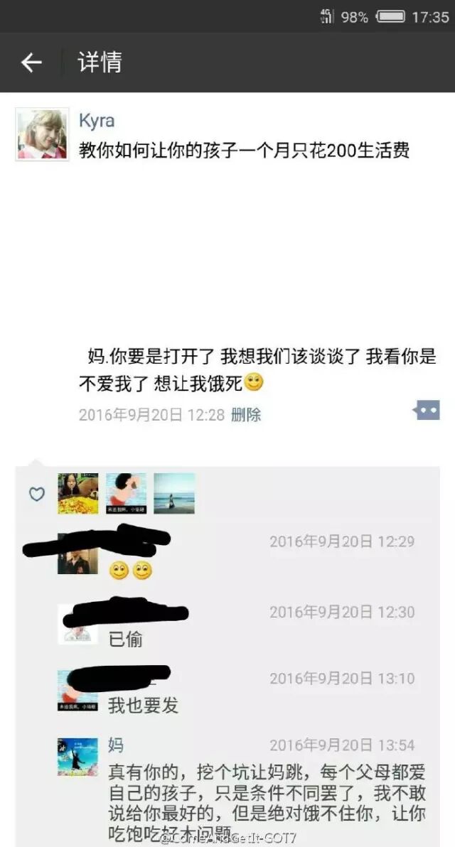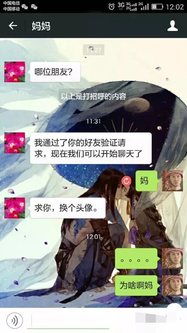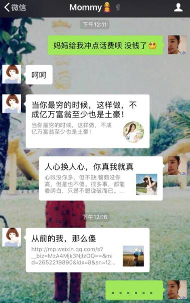 以前每次放假回家,小编经常会被父母怼,什么早上睡太晚,房间太邋遢,衣服不整洁,长得那么帅还找不到女朋友... 不过偶尔念叨几句,我还能承受。直到后来加了他们的微信后,这种念叨,完全打破了时间和空间的限制... 很多人都有像小编一样的遭遇,来听听他们的吐槽... 无时不在的思想道德教育 就像小时候饭桌上的念叨 时刻纠正你审美 就像回家时骂你太邋遢 这么多年了 加了父母的微信后 才知道自己不是亲生的 说多了都是泪,自从加了父母的微信后,更加相信自己是充话费送的,每天都被怼成狗了,小编心疼自己一秒 猜你喜欢 这些突如其来的尴尬,承包了我一整年的笑点! ?动漫中最让人震惊的剧情Top10,哪一幕最出乎你的意料? ??这些动漫梗……我可以玩一年! ??壁纸来袭||《我的朋友很少》 | |