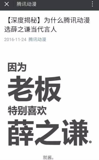 11月25日,腾讯动漫上线了一个名为《薛之谦2个月没写段子,结果憋了个大招》的H5。在这个H5发布之后,大家都会问:腾讯动漫为什么会选择薛之谦代言?之后腾讯动漫官方公众号又发出了一个深度揭秘文章,答案是因为老板特别喜欢薛之谦。