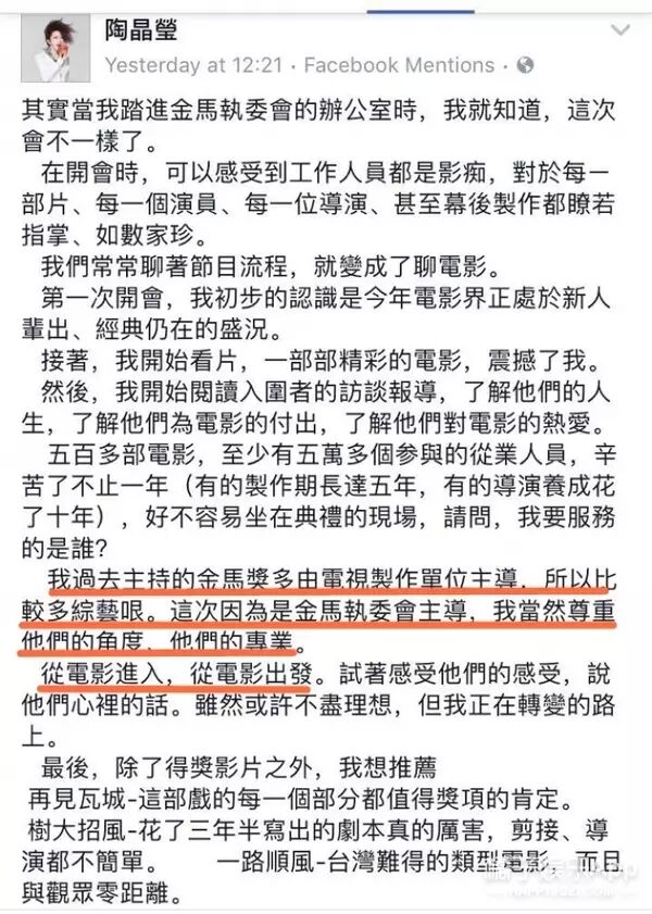 例如冯小刚在颁奖时说范冰冰为了得到这个奖,到处烧香拜佛,捐了好几座庙; 就像《七月与安生》,就因为这部电影没抽到签,所以除了12位金马评审外,台湾地区再没有人看过,相同经历的还有《我不是潘金莲》和《美人鱼》等等; 还有就是舒淇的肚子了,主持人陶晶莹在台上与舒淇进行互动时就曝出了怀孕等综艺梗 “很感谢舒淇今天来颁奖,竟然还穿着高跟鞋。 让大家猜去吧,我们不承认也不否认,反正这样还能有三个月的热度。” 同时陶晶莹还用手在小腹比划,对舒淇怀孕的暗示不要太明显 陶晶莹又提到范冰冰:“新闻中心现在都在追问舒淇的身体状况 我没有办法回答,我只能搞得更大 其实范冰冰……不能讲对吗?现在不能讲?” 此时,台下的范爷脑袋摇的跟拨浪鼓似的,连忙挥手否认 事情越闹越大,陶晶莹事后在脸书上发布500字长文作出回应: 颁奖礼上的桥段是为了节目效果,有事先设计过。 这次主办单位不再是电视台,自己的主持风格也转从电影角度切入 认真做足了功课,而非充斥综艺梗 但网友回应似乎并不买账 其实这也不是陶晶莹的主持功力第一次受质疑了 ----------我是尴尬的分界线---------- 在韩国第50届百想艺术大赏颁奖礼上,陶晶莹作为中国嘉宾主持上台颁奖 她不仅在金秀贤走上台的过程中一秒钟变“花痴粉”,拿着手机对着金秀贤狂拍 在为金秀贤献花时甚至行“屈膝大礼”,着实把都教授都吓了一跳 只能连忙尴尬屈膝回礼 陶晶莹开始滔滔不绝地讲述起那英的情感故事 “其实她是一个非常有女人味的女人,所以她的情歌才能唱得这么好。 很多时候都是我们两个煲电话粥,讲讲讲,所以我才会知道她选男人的标准。” 未等陶晶莹话音落下,那英就连忙打断,大呼“导演,快来!” 而陶晶莹意犹未尽,将爆料进行到底,让揭面后的那英尴尬不已 1999年第36届与周华健搭档 (年代久远得能找到的视频资料还是这样的...) 尤其是第46届是金马奖历史上第一次启用单独主持人形式 BUT.... 陶晶莹在2013年主持第24届金曲奖意外表现失常 自弹自唱的谐星式开场被网友狠批,认为其表现有失金曲奖的专业性 陶晶莹主持金曲奖恶评不断,不少观众认为她脱口秀单薄、和周杰伦的开场也很无趣,堪称她主持生涯一大污点,传陶晶莹因此气辞“三金”。(来源天涯社区)在周杰伦和蔡依林合体上台颁奖时,陶晶莹带头起哄,让双J抱一个来“真正合体” 结果当事人也只能尴尬笑笑然后....忽略她的话 在那届金曲奖之后,受访时她就表态要给新生代机会,不再接“三金”主持棒 今年在金马执委会力邀下睽违七年第四度出任金马奖主持人,谁知又“祸从口出” 陶晶莹在介绍范冰冰时说: “冰冰在刚刚走红毯时真的是很美,真是走的一腿好红毯,上的一众颁奖台”。 这话听着怎么就怪怪的呢 但现在,已经拿过国际电影节影后的范爷却仍被调侃“走的一腿好红毯”,不知范爷心里作何感想.... 这时嘴快的陶子立马接道:所以你讲出了很多潜规则是吧 这让网友们猜疑,陶晶莹这话是在暗讽芒果台今年10月的金鹰节 当时节目组为到场却没获得影后的刘涛准备了另一个奖项而且放在最后颁发 这让网友们直呼影后是谁傻傻分不清楚 胆子不小噢 之所以这么说,其实陶子最大的“口祸”损失也是跟芒果台有关的 当时正值芒果台亲子真人秀《爸爸去哪儿》第一季播出,红遍了两岸三地 也让参加节目的爸爸和萌娃们家喻户晓 但陶晶莹说“是我家里很缺钱吗?我干嘛让小孩受这个苦呢?” 这让带着孩子上节目的一众家长们情何以堪.... 那时恰逢她要发新专辑,湖南台表示不要帮她制造噱头 陶晶莹也为自己的口舌之快付出代价,发布了一段视频公开向湖南台道歉 不过现在看来,她还是没有吸取教训呐 这么好的主持人,怎么就掌握不好主持的“度”呢 | |