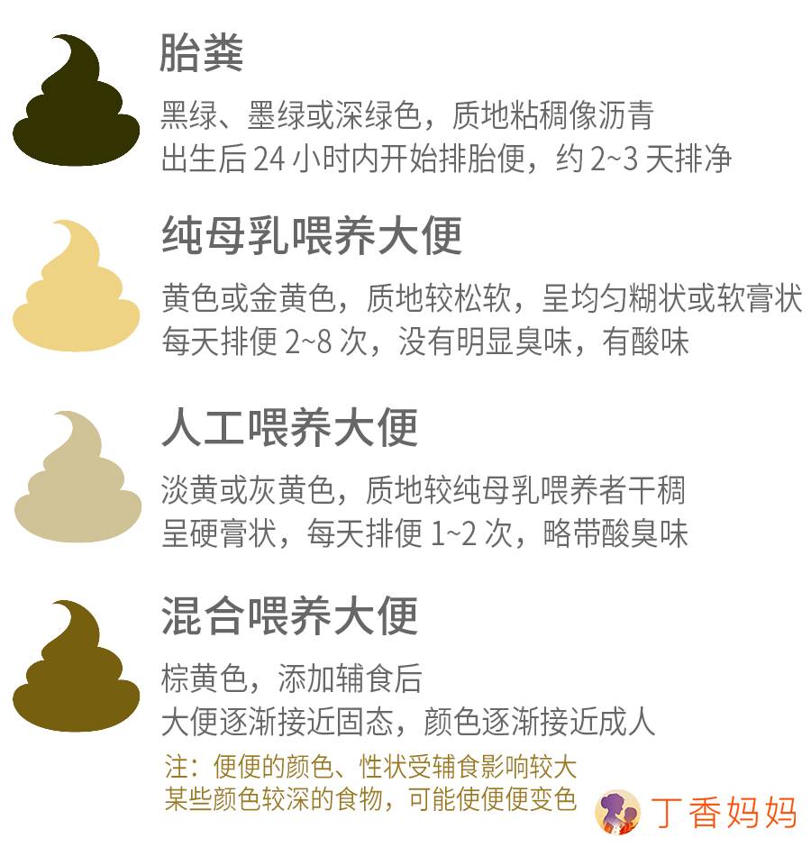 曾几何时,丁妈也是一个没有办法自如谈论屎尿屁的「小清新」,但自从生下宝宝,就直接转变为在吃饭中途给孩子处理粑粑,之后还能面不改色继续吃饭的「重口味」。 宝宝的吃喝拉撒,也成了丁妈每天最关心的问题。在宝宝还比较小的时候,屎尿屁稍微有点变化,都会让丁妈一阵儿疑心,是不是有问题。 然而在查资料、看文章、咨询儿科医生之后,丁妈发现那些让我担忧的问题,有些根本就不是问题。 相信跟丁妈一样,关心宝宝屎尿屁问题的爸妈还有很多,希望今天的这篇文章,能帮爸妈们少一点担忧、多一点淡定。 一、便便的那些事儿 宝宝今天拉没拉、拉几次、便便软不软、什么颜色的……这些困扰爸妈们的便便问题,到底哪些才是真有问题? 当然,要辨别是不是有问题,首先需要了解一下正常便便什么样。 这类基本上可以算是「教科书式」的便便了,不少爸妈都希望自家宝宝每天的便便都是这样的,但标准便便不常有。 2. 看起来异常的正常便便 大便有奶瓣 便便会出现奶瓣或黄白色乳凝块,主要是因为母乳或是配方奶中脂肪或酪蛋白含量超过宝宝的吸收能力。宝宝吸收不了那么多,自然就会跟粪便一起排出了。 黄绿色便便 婴幼儿肠道相对较短、蠕动也较快,所以食物在肠道内待的时间往往也比较短。如果消化的时间不够长(胆红素没有完全转变为粪胆素而是被氧化成胆绿素),便便的颜色就会趋于黄绿色。 深绿色便便 宝宝正在补充铁剂、添加了强化铁成分的辅食,或是辅食中含有较多深绿色蔬菜,就可能会出现绿便。但如果这些情况都没有,宝宝却出现黑色的大便,就要及时看医生。 大便带黏液 婴幼儿的胃肠功能发育不完善,肠道表面分泌的黏液不能很好地被重新吸收,就可能会有一部分黏液跟大便一起被拉出来。在正常情况下,粪便中只会混合少量的黏液。如果黏液过多,就要警惕可能是发生了某些胃肠道疾病。 大便带血丝 健康宝宝大便带血丝的原因,目前还没有明确定论,可能与宝宝胃肠道发育不完善有关。此外肠道过敏也可能会出现血丝。但只要宝宝精神好,体重、身长发育、吃睡等都好,就不必太担心。如果带血丝的情况持续存在,就看医生了。 好几天没拉(攒肚) 3~6 周以后,宝宝能量消耗增多,消化吸收能力增强,母乳被消化吸收得比较彻底,残留的固体残渣少,积攒几天才能形成大便,但排出的是正常大便,没有硬结,排便也不痛苦。攒肚多见于母乳喂养宝宝,奶粉喂养的宝宝,如果几天没拉,就要考虑是不是便秘。 边吃边拉 婴幼儿进食后肠道蠕动加快,很容易边吃边拉,或是一吃完就拉。但这可不是他刚吃下去的东西,而是早已形成的便便。食物从吃进去到最后的残渣被排出来,儿童平均需要 33 个小时(母乳也需要好几个小时),不可能刚吃进去就拉出来。 3. 这些情况要当心 异常的大便颜色:便便偏灰白,不是胎便却出现黑便,血红色甚至混有鲜血的便便。 腹泻或是便秘:对年纪较小的宝宝,并不能只靠排便的频率来判断,还要结合便便的性状以及其他症状,比如发热、呕吐、排便哭闹、拒绝排便、大便带血等综合判断,如果家长无法判断,需要及时找医生。 二、小便的那些事儿 说完了最重口味的屎,接下来谈谈稍微不那么重口味的尿。 1. 正常的尿液什么样? 正常情况下,宝宝的尿通常是淡黄色或深黄色,而且尿液透明清亮,宝宝在排尿过程中也不会有不舒服的感觉。 宝宝排尿的频率和尿量与摄入的奶量、以及年龄有关。 出生后的头几天,摄入的奶量比较少,每天排尿约 4~5 次; 出生 1 周以后,排尿会明显增加,甚至能达到一天 20~25 次; 宝宝到 1 岁左右,基本就会稳定于每天 10~15 次; 12 岁时就和成人相似,每天 4~6 次。 2. 哪些情况不用太担心? 粉红色结晶 宝宝的肾功能发育还不太完善,在天气炎热或是奶量不够的时候,尿片上可能会出现粉色痕迹,这通常是尿中的尿酸盐结晶(并不是血液),增加喂奶次数往往就能改善。假如尿片上长期都有粉色痕迹,建议咨询医生。 尿液偏黄尿少 颜色越深表明尿液越浓,尿液越浓表明宝宝摄入水分越少,对 6 个月以内的宝宝可以适当增加母乳(尤其是前奶)或是配方奶(一定要按比例冲调),对于已经添加辅食的宝宝可以适当多喂些水。 大宝宝尿床 宝宝控制膀胱的能力,基本要到 5 岁以后才能发育成熟,在此之前夜间偶有尿床是非常正常的。不是故意尿床,而是真的控制不了。如果孩子超过 6 岁,还是白天晚上都会尿床或是尿床已经影响了孩子的正常生活,那么就建议去看医生,及早干预。 3. 要警惕尿路感染 不要以为小宝宝就不会发生尿路感染,事实上他们发生尿路感染的几率还比较高。 宝宝发生尿路感染,最明显的症状就是发烧,此外如果宝宝经常哭闹、拒奶、呕吐、腹泻、烦躁不安,甚至抗拒排尿、排尿时哭闹加重,或是排尿频繁、每次尿量却不多,尿液浑浊、尿有臭味或尿中有血等,都可能是发生了尿路感染,家长要提高警惕。 三、屁的那些事儿 对于屁,其实并没有那么多要说的,但关心屁的家长着实不少。 1. 屁多屁臭不是事儿 食物在肠道内被细菌分解产生的气体,就是屁的主要成分。 1 岁以内的宝宝主要食物是母乳或配方奶,其中的乳糖在肠道细菌的作用下,就会产生大量气体。 同时,宝宝在吃奶或是哭闹的时候也会吞下比较多的气体,其中一部分气体进入肠道,成为屁的一部分。 如果食物中蛋白质比较多,经过肠道菌群