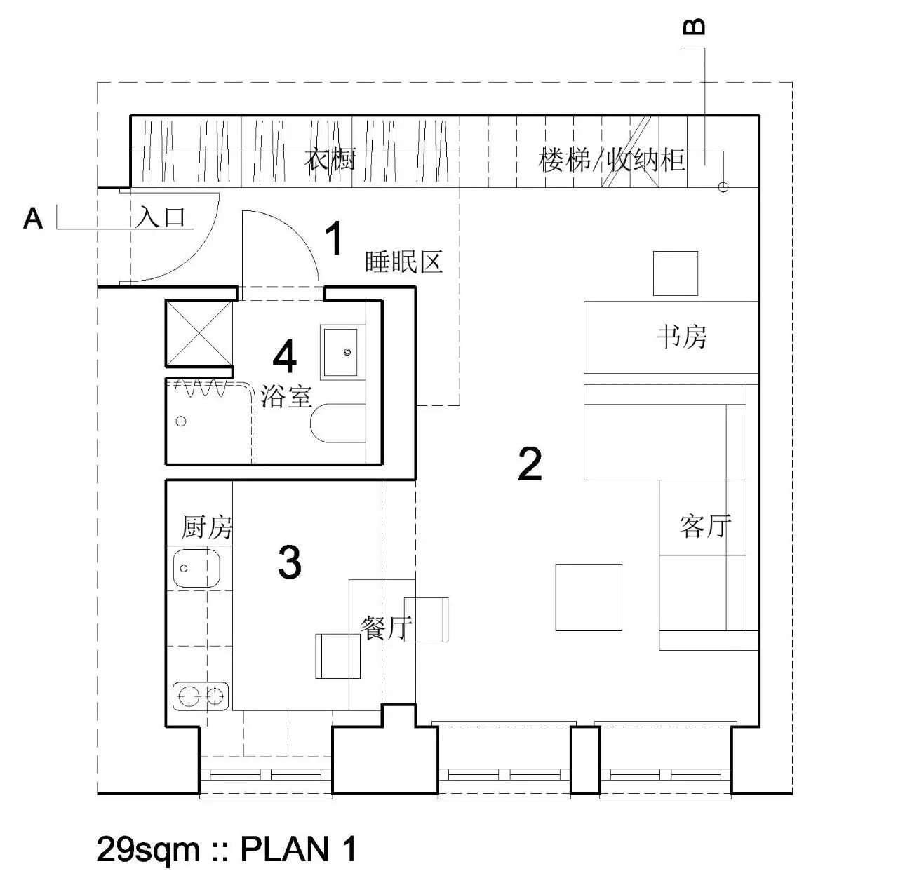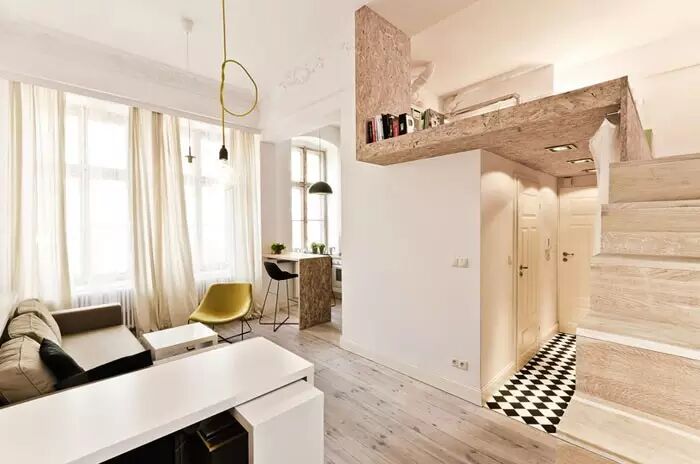 房子小,也要大气过生活! 波兰?弗罗茨瓦夫 房君今天看到朋友圈的一篇文章《你的工资能在北京哪个区买房?!》,然后整个人就不好了,朝阳、海淀啥的根本买不起,即使在延庆买房,也要月薪不低于2W……就这样默默地关闭文章,然后静静地看了会儿远方,决定今日推送一篇小户型案例给自己打气,只要设计的好,小房子也能住得很舒服! 平面图▼ 房子是在波兰的弗罗茨瓦夫,只有29㎡,不过好在层高有3.7m,利用高度在走廊和浴室上面搭出一个睡眠区,剩下的厨房、餐厅、客厅、书房都做了开放式的设计,这样会显得空间比较大。 黑白小方砖铺出了一条入口走廊的通道。3.7m的空间,睡眠区占去了1.35m,虽然人不能站立,但睡觉还是很宽敞的;下面1.85m一边是浴室,一边做了通高的衣柜,整整一堵墙的柜子,解决了收纳的问题。 简洁的厨房,周边的空间都做了封闭式的橱柜,这样显得干净利落,小小的吧台也可以用作餐桌。 白色的橱柜配黑色的墙壁,好酷啊! 会客区是简洁的沙发和小几 紧挨着沙发放了工作台 步入睡眠区的楼梯,下面拿来做书柜,空间真是一点也没有浪费~ 从睡眠区看向客厅和书房。房君发现沙发也可以作为临时床铺,这下客房都有了,哈哈!谁现在还记得这房子只有29㎡呀! 从客厅看向楼梯~房友们有没有注意到,房子里好多家具和搭建睡眠区都用到了一种材料——定向刨花板,也有叫欧松板的,它承重抗压,保温防潮,甲醛释放小超小。房君在好多建筑师的工作室都见过这样的家具呢~ 在入口对面的墙上安装了一扇假门——假装还有一间房,哈哈!我真心服了房主,超级幽默~ — end — 设计:3XA 装个好房子出品 公众号如需转载本文,请后台回复“转载”获取授权图 转载无授权图一律举报处理! 注:转载必须保留屋主信息,否则视为侵权 投稿、合作 请邮件至:ihaofangzi@qq.com 装个好房子 探寻美好居住方式,一起装个美美的家 ▲ 长按二维码,关注装个好房子 精彩推荐(▼点击图片跳转) 你可能还想读(▼关注后后台回复数字) 回复『1』『原创』| 查看【i好房子】系列文章 回复『2』『玄关』| 查看玄关的设计和装修 回复『3』『厨房』| 查看厨房的设计和装修 回复『4』『客厅』| 查看客厅的设计和装修 回复『5』『阳台』| 查看阳台的设计和装修 回复『6』『卧室』| 查看卧室的设计和装修 回复『7』『收纳』| 查看收纳技巧 回复『8』『飘窗』| 查看飘窗的设计和装修 回复『9』『背景墙』| 查看背景墙的设计和装修 回复『10』『卫浴』| 查看卫浴的装修和设计 回复『11』『儿童房』| 查看儿童房的设计与装修 喜欢就按个 | |