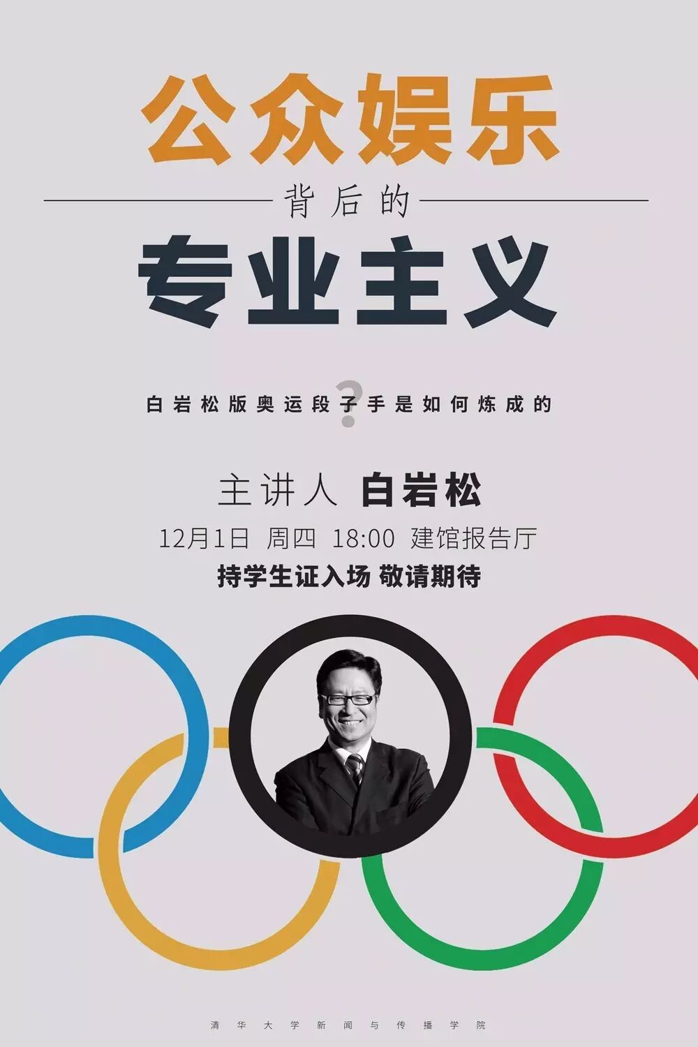 这些“白式解说”你一定还有印象: 我觉得中国代表团的西红柿炒鸡蛋的服装还可以吧?毕竟很多中国人学会炒的第一个菜就是西红柿炒鸡蛋,还真有点代表特色,另外也比较低调,不去跟别人抢风头。西红柿炒鸡蛋,中国人的国民菜。 索马里,这个国家,多一个人当运动员,就少一个人当海盗…… 真不好意思,2005年卢森堡曾荣膺“全球最安全”城市的称号,这件事就不用告诉里约了。 开幕式是三小时还是四小时,取决于运动员走得有多快啊…… 奥运历史上首支难民代表团走进现场!掌声虽然热烈,但不是喜庆的时刻,这说明我们还有很多问题。我们希望这是第一支,又多么希望这是最后一支难民代表团。 白岩松的开幕式解说之路始于2010年广州亚运会。新闻视角加即兴评述的白氏解说风格彻底打破了传统的“诗歌朗诵”式的旁白,引发了广泛好评。解说信息量大,贴近性强,主观情感强烈,有趣通俗都是“白氏解说”能够俘获民心的重要因素。 现在问题来了 怎样的知识储备能让你成为“自带弹幕的解说员”? 成为“国家级段子手”需要具备怎样的能力? “白氏解说”的娱乐背后蕴藏着怎样的专业主义? 如果你对这些问题充满好奇 或是有志于成为一名有内涵的“段子手” 再或者你是这位“国家级段子手”的迷妹 那你一定不能错过这个 ↓↓ 白岩松老师带着他的“段子”进清华啦! 演讲题目:公众娱乐背后的专业主义 演讲人:央视主持人 白岩松 时 间:2016年12月1日(周四)18:00 地 点:建馆报告厅 (凭清华学生证入场,如果非清华学生,可以留下个人身份信息,持本人证件入场) 你和“国家级段子手”,只差一场讲座的距离哦~ 微博:清华大学清新视界 长按右侧二维码即可关注 | |