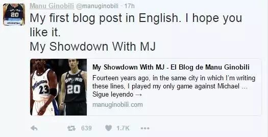 今天吉诺比利在他的推特上隆重推出了自己的第一期英语版推特,介绍与篮球之神迈克尔-乔丹在场上的“第一次 ...