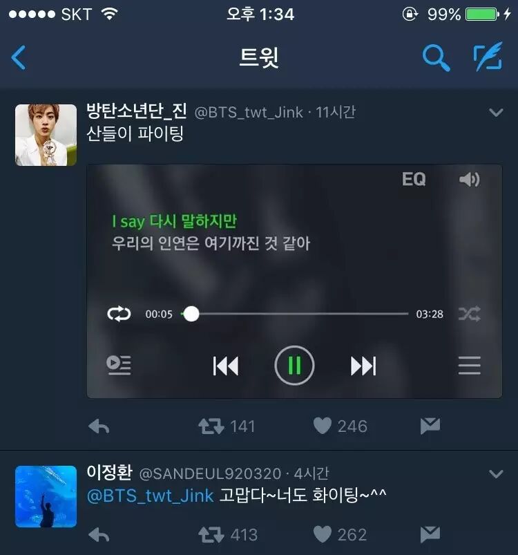 feat.B1A4灿多&防弹少年团JIN B1A4回归后 灿多的至亲 防弹少年团成员JIN 在推特上传了B1A4主打曲《A LIE》的歌词截图并留言道 “灿多啊 fighting” 可是上传的歌词截图那两句是 “I SAY 就算再说一次 我们的缘分似乎到此为止了” ??? 随后灿多回复JIN说:“谢谢啦!你也fighting~^^” 两位都太可爱啦!! cr:instiz 点击【阅读原文】下载追星神器【爱豆APP】 --------------------------------- 关注「idolAPP」 了解更多最新资讯 下载「爱豆App」 了解偶像的最新动态 | |