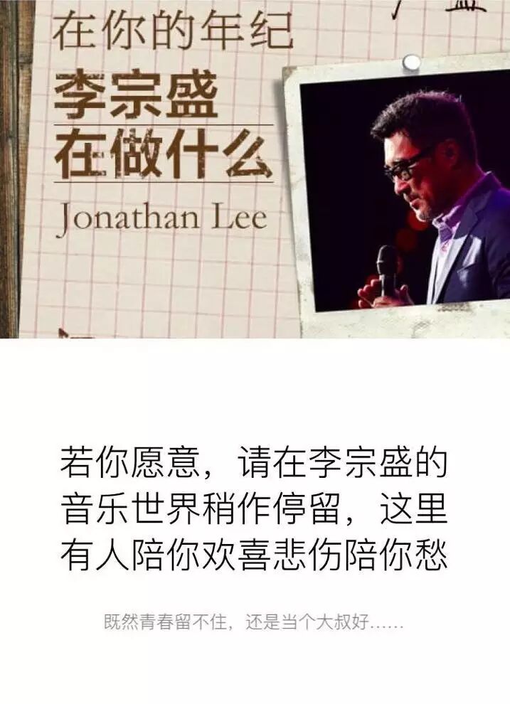 在《既然青春留不住》的演唱会上,当唱起《爱的代价》时,你能听到李宗盛的这么一段话:「李宗盛大老远跑过来跟你们合唱,机会难得,三十周年,大点声儿!」 没有开过演唱会的人都会觉得,这或许是歌手最骄傲的时刻 —— 有人进来你的音乐世界,听你的故事,「陪你欢喜悲伤陪你愁」,而你的歌也唱出了别人的青春。 李宗盛自己曾经说过:「从小李的青春年少,听到我的两鬓斑白,所以,我肯定有更珍贵的东西还与你们分享,无以为谢,唯有写歌,给在乎自己的人,和自己在乎的人听。」 虾米音乐联合轻芒生活为你准备了 一本关于李宗盛的电子杂志,这些文章为你解读了这些歌背后的创作故事,带你了解李宗盛对于成长、生活和爱情的理解。 或许看了这些文章之后,你才更能听懂李宗盛大哥最新数字专辑《既然青春留不住,还是做个大叔好 演唱会巡回影音纪录》。 如果你想看更多关于李宗盛的故事,请移步「轻芒生活」App 并订阅「李宗盛」杂志。 如果你觉得文字太苍白,那么就带起耳机,边看边听吧!点击下方阅读原文,试听李宗盛最新数字专辑! | |