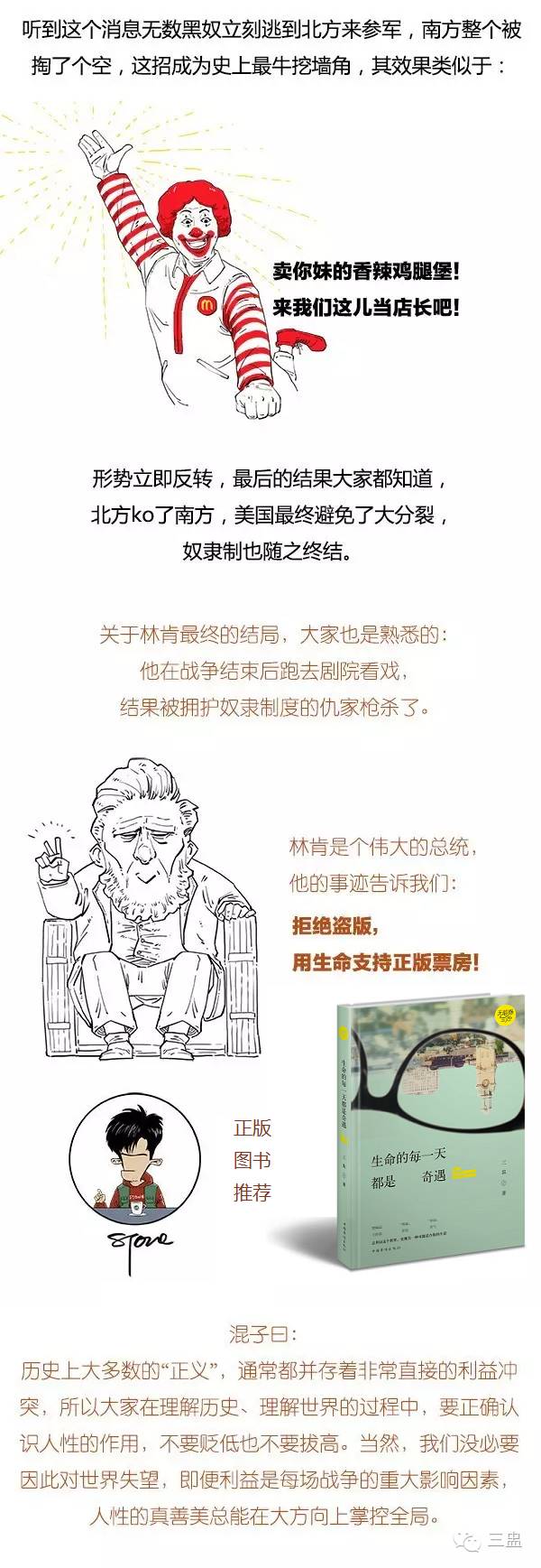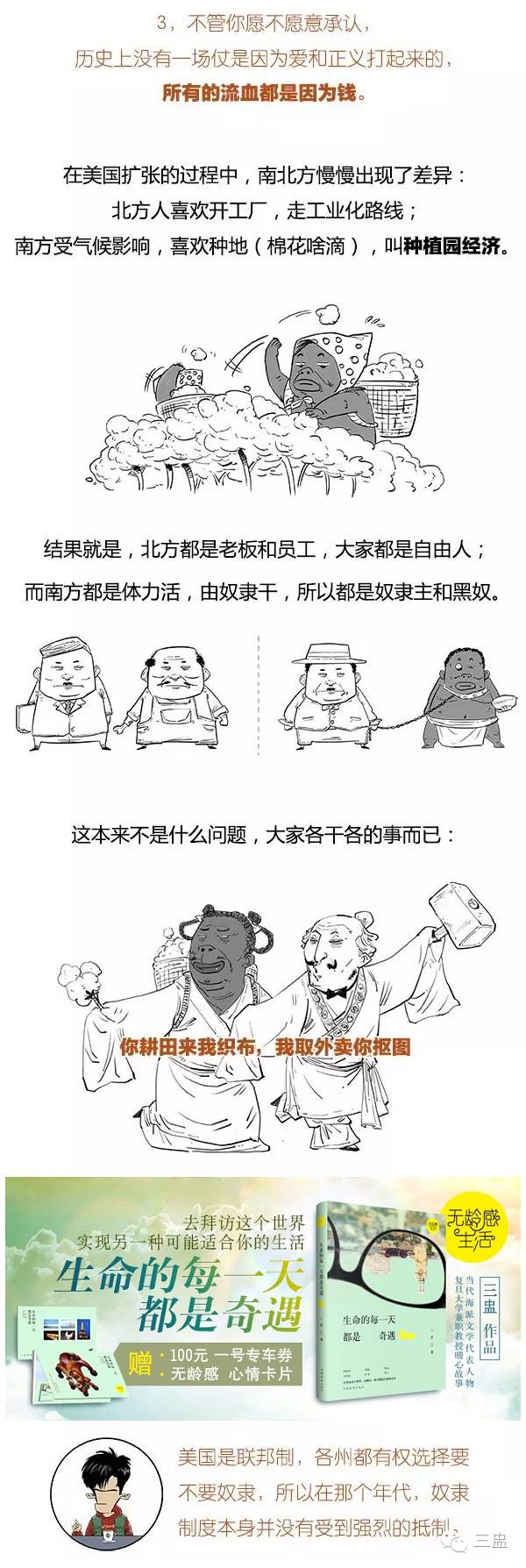 卡尔·马克思 说:南北战争代表了军事史上绝无仅有的大战争。 辣么,南北战争究竟怎么回事? 【背景】南北战争即美国内战,是美国历史上唯一一次内战,参战双方为北方美利坚合众国和南方的美利坚联盟国。战争最终以北方联邦胜利告终,战争之初本为一场维护国家统一的战争,后来演变为一场为了黑奴自由的新生而战的革命战争。 南北战争参战的350万人中绝大多数为志愿兵。战争造成75万士兵死亡,40万士兵伤残。南北战争具有极伟大 的、世界历史性 的、进步的和革命 的意义…… 看了以上 头都 大 了? 我们还是简单点 32倍快进走起 ● ● ● 往期回顾: 爆笑世界简史?《独立战争》 ▼ 往期回顾: 爆笑世界简史?《爆笑欧洲简史》 请在本号后台“历史消息”中寻找 | |