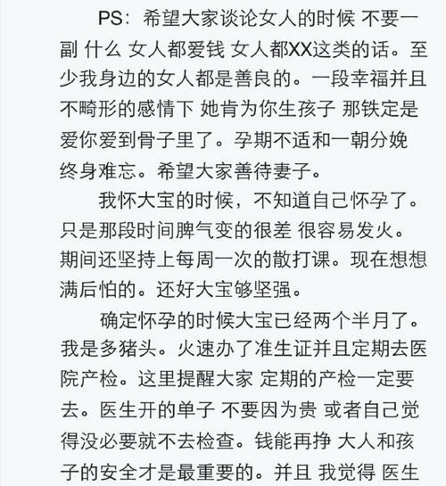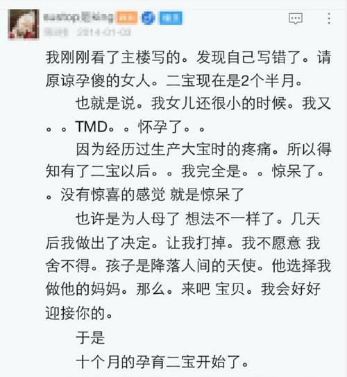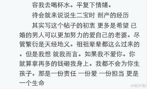 还记得,伊能静在上金星秀时,含着泪和金星说,我想给他生个孩子。我想一个女人能心甘情愿变丑、忍受剧痛,是出自于爱。 一位妈妈露珠分享了一次顺产,一次剖腹产的切身经历。 隔着屏幕都能感受到这种生产的痛 尽管血脉传承是天经地义,祖祖辈辈都是这么过来的。但是我想如果不爱,就算拿再多的钱砸我身上,我都不会为你生孩子。那是一份责任,一份爱,一份担当,更是一个生命。 ? 怀孕妈妈都在关注 ? 专注为孕妇提供从怀孕到分娩的孕产保健知识。包含备孕、胎教、胎儿发育、营养饮食、孕期保健、孕期检查、孕期心理、常见疾病、孕期安全、多胞胎等。长按二维码三秒,点击“识别图中二维码”,关注怀孕第一自媒体:怀孕百事通 | |
