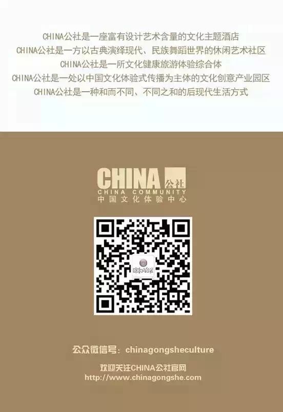 CHINA公社是一座富有设计艺术含量的文化主题酒店; CHINA公社是一处以古典演绎现代、民族舞蹈世界的休闲艺术社区; CHINA公社是一种和而不同、不同之和的后现代生活方式。 微信号:chinagszz