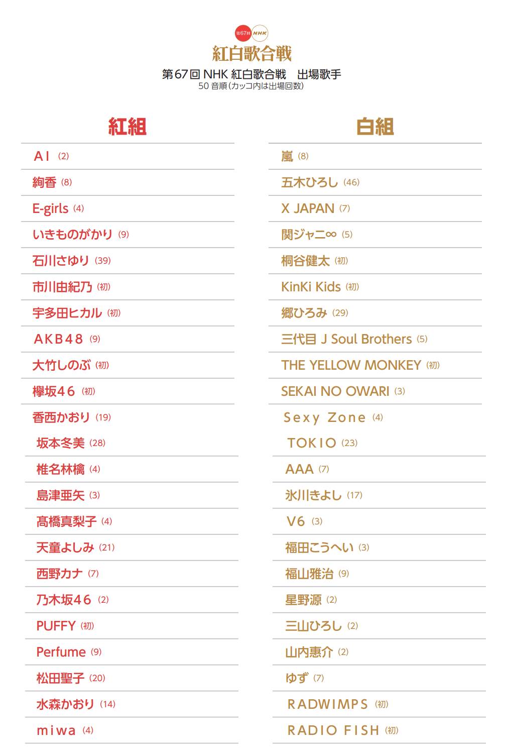 点击日剧与音乐部屋(ID:rijuyinue),这儿有你想知道的明星资讯,想看到的日剧日影,想听到的日本音乐 今天NHK公开了今年红白歌会的出场阵容,详细阵容见下图 除了岚、AKB48、TOKIO、perfume、福山雅治等常客外,今年的名单上我们还看到了不少新鲜面孔。 即将迎来出道20周年的杰尼斯人气偶像Kinki Kids实现红白初登场,组合出道至今的37张单曲全部登顶榜单冠军,创造了吉尼斯世界纪录,不知道作为20周年纪念,是否会唱经典的出道曲《硝子の少年》呢? 今年复出时隔八年发行新专辑的超级天后宇多田光也将首次在红白登场,宇多田光现阶段正身处伦敦,年末也计划在伦敦当地度过。因此她的红白处女秀估计是在国外卫星直播的形式展开。 索尼音乐旗下坂道系偶像女团欅坂46在出道年就红白登场,实现偶像女团的一大壮举。 桐谷健太为au系列广告演唱的《海之声》可谓是今年日本传唱度最高的歌曲之一,他也不出意外的将在红白演唱这首歌,作为演员的他实现第一次红白登场。 另外,第一次登场的还有为今年日本电影票房冠军《你的名字。》演唱主题曲的RADWIMP,乐队将在红白舞台上演唱《前前前世》。 今年火遍全世界的《PPAP》(Pico太郎)将在特别环节中登场 不过令人惋惜的人,即将解散的国民天团SMAP没有出场。自1991年出道以来,SMAP共23次登上红白歌会的舞台,6次表演压轴曲目。在杰尼斯事务所发布SMAP解散的消息之后,有不少粉丝猜测,红白歌会或将成为SMAP最后的舞台,但这一“希望”也最终落空。据悉,NHK会长籾井胜人曾亲自出马,向杰尼斯事务所社长喜多川表达了希望SMAP出演的意愿,并进行了全力交涉,但从目前状况看五人很难统一步调,因此无缘红白歌会。 小科普 红白歌会,日文全称红白歌合战,是代表日本最高水准的歌唱晚会。参赛者都是从当年日本歌坛中选拔出来的最有实力、人气旺、人品好并受到广大歌迷喜爱的歌手,每年出席红白歌会的歌手都会根据当年的实际成绩、话题度、知度等评衡量。因此能登上红白歌会对一位歌手来说是巨大的荣耀。 征稿!部屋大征稿!向数万日饭推荐你爱的日剧,安利你饭的偶像 长按上方二维码可添加部屋君的私人微信 点击阅读原文可玩各种小游戏 | |