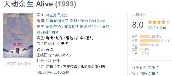 前两天,新闻里传来又一个球队遇难的噩耗 11月29日,巴西球队发生坠机事件,77人丧生,仅有5人幸存 之所以说“又”,是因为在国际体坛,空难已经屡见不鲜。它就像幽灵一样,几乎摧毁了一代又一代人的记忆 1972年10月13日,一支乌拉圭橄榄球队也曾发生类似的坠机事件,坠落地在安第斯山脉的一座大雪山中 16人当场死亡,随后又有13人陆续死去,为了生存, 幸存球员靠吃遇难同伴的尸体活了下来 这起坠机食人肉事件震惊全球,美国曾以这个真实故事为蓝本,拍摄了一部好莱坞电影—— 《天劫余生》I 1993 ALIVE 电影又叫《我们要活着回去》,由弗兰克·马歇尔指导,同时他还指导了电影《南极大冒险》,并参与制作了《夺宝奇兵4》 与其说这是一部灾难、冒险电影,到不如说是对“坠机食人事件”的纪实和还原 豆瓣评分 8.0 影片除了不少灾难场面外,还着重描绘了人性对于生存的渴望,并一度激发了美国社会对于生命与道德的激烈讨论 影片开始,导演以其中一名幸存者的视角回忆了当年事故的结果 东尼——球队队长 在空难发生后曾组织大家有序分配食物和自我救援 1972年,南美洲某橄榄球队和亲友,飞越安第斯山要到邻国智力去参加比赛,这便是事故发生的背景 这群年轻的男孩们丝毫没有预判到坠机的发生 甚至在飞机遇到气流强烈震动时,还举手欢呼 真是急坏了我们这波吃瓜群众~~ 然而灾难总是来得如此猝不及防...... 死亡 重伤 严寒 饥饿 雪崩 事故 以及处处暗藏的危机 球队成员一个接一个的失去 零下三十多度的大雪山里,等待救援的过程中,幸存成员面临的最大问题就是食物 唯一能够帮助他们活下去的就是罹难同伴的尸体 吃同伴的尸体,这对谁来说都是一个巨大的心理障碍 他们几度挣扎、徘徊 为了生存,他们立下一个“恐怖协议” :如果我死了,你可以吃掉我 要迈出这一步着实不容易 但求生的本能还是战胜了一切 数月后,他们开始带“人肉干粮”出雪山,踏上了寻求救援的艰难之路...... 罗伯特——这场真实灾难中的幸存者之一,他回忆说,自己曾想过一死了之,但想着自己若死去,母亲会伤心欲绝,这使他下定决心食人肉 “我想到母亲,只想尽可能生存回家见她。我吞下了一块(人肉),(心理上)跨进了一大步。 假如我死,那只是我的事,但如果造成其他人的痛苦,我无法忍受。我为了母亲尽力而为,这是让我生存下去的动力。” 即使罗伯特与其余15名生还者回国后被奉为“英雄”,但更多人认为他们是食人族。 罗伯特辩解,当时在山上只想着求生 “我只想到吃什么、在哪里安身,一切回归最基本。” 他们的行为无论从道德还是法律的角度去看,都会引发各式各样的讨论 只有真正经历过才懂得,如此迫不得已的选择,带给他们的究竟是怎样的心理折磨—— “我人生中最大的悲哀就是我不得不去吃一具人的尸体。我一直问自己这样做是不是值得?但我必须活着。 我们今天能够活着站在这里的唯一原因,是我们有回家的目标、我们所爱的已经逝去的人给了我们生命。” 今天,让我们先暂且放下对这种行为的偏见和讨论 对历经生死的幸存者表示衷心的祝福或许来得更有意义 另外,君君也想借这部电影,向这次遇难的巴西球员以及所有在天灾人祸中不幸丧生的同胞们表示深深的哀悼! 最后,今天是“世界爱滋日”,又是一个充满爱与关怀的日子 欢迎大家留言,点赞前三的,君君送你们 杜蕾斯 !款式随你挑~ 截止12月2日15点(PS:不要问我杜蕾斯什么) ▼一起电影,干掉孤独 | |