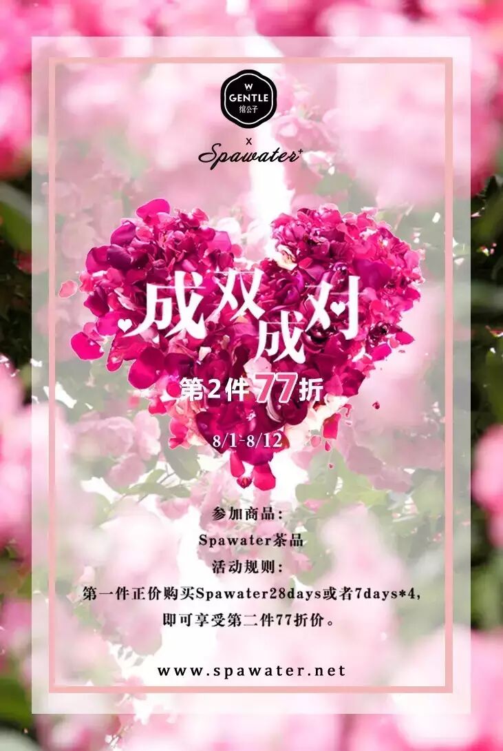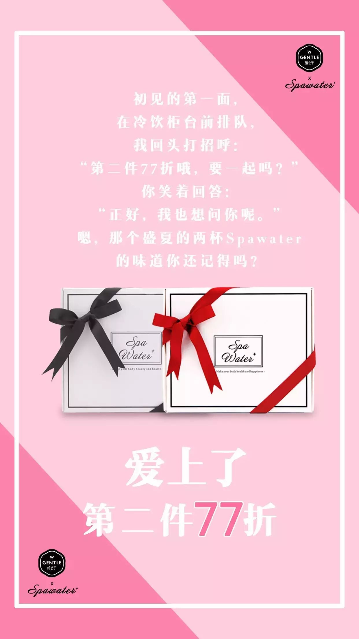 Spawater给你讲个故事.... 初见的第一面,在冷饮柜台前排队, 我回头打招呼:“第二件77折哦,要一起吗?” 你笑着回答:“正好,我也想问你呢。” 跟你的他“她”一起喝水吧~ 第二件77折哟~ Spawater就是那么任性 经销商小伙伴们: “我爱你” 简!单!粗!暴! 我们不做牛郎织女, 因为他们相距太远而相见又太短; 我们要做我们自己, 因为有你在我身边把我的心牢牢拽住! | |