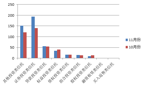 截止到11月30日,2016年11月份56家信托公司共计成立476款信托产品,其中308款产品公布了成立规模,产品总成立规模为648.16亿元,10月份的总成立规模为676.70亿元,环比小幅下降4.22%。 从信托产品的预期收益率来看,11月份共有332款产品公布了预期收益率,平均预期收益率为6.06%,相比10月份下降5.75%。 从信托产品的类型来看,证券投资类信托成立了193款;其他投资类信托成立了152款;贷款类信托成立了56款;权益投资类信托成立了35款;债权投资类信托成立了16款;组合投资类信托成立了15款;股权投资类信托成立了9款;未成立融资租赁类信托和买入返售类信托。相比于10月份来说,各类信托产品升降态势有所分化,证券投资类信托、其他投资类信托、组合投资类信托以及贷款投资类信托的增长幅度分别达到37.86%、26.67%、15.38%以及3.70%;股权投资类信托和权益投资类信托分别下降了35.71%和12.50%。 各类型信托10月份与11月份产品成立数量比较 具体到单个信托产品的发行情况,上述308款公布成立规模的产品中,成立规模最大的是华融国际信托发行的“中节能华禹绿色并购投资基金集合资金信托计划”,该产品实际募集金额高达24亿元;紧随其后的是交银国际信托发行的“英大鲁能集合资金信托计划”,该计划实际募集金额也高达20亿元;除此之外,来自华鑫国际信托发行的“崇实1号集合资金信托计划”,其实际募集金额也达到了17.81亿元。 华融国际信托发行的“中节能华禹绿色并购投资基金集合资金信托计划”属于一款证券投资类信托,并未公布预期收益率,信托资金用于参与投资设立中节能华禹绿色产业并购基金,该并购基金目前已经完成对主营业务包括城市服务及市政固废和工业废弃物处理服务的一家西班牙公司的收购;交银国际信托发行的“英大鲁能集合资金信托计划”,是一款其他投资类信托,并未公布存续期与预期收益率;华鑫国际信托的“崇实1号集合资金信托计划”则为一款权益投资类信托,存续期4个月,同样未公布预期收益率。 相比于10月份有14家信托公司单月产品成立数量超过10只的情况来看,11月份各信托公司的产品成立数量情况略有增加,共有17家信托公司单月成立的产品数量超过10只,其中对外经贸信托以58只的数量位居第一位,华润深国投信托和中航信托分居第二、第三位,成立数量分别达到了36只和31只。另外相比于10月份来说,各信托公司产品发行数量增减不一,对外经贸信托和四川信托的增加数量最为明显,分别达到了28只和16只;而云南国际信托以及中航信托的减少数量分别达到了16只和9只,排在所有信托公司的前两位。 11月单月信托产品成立规模超过10亿元的信托公司共有23家,这一数字较10月份的22家基本持平。成立规模最多的是华鑫国际信托,成立规模达到66.99亿元;募资规模不足1亿元的信托公司由10月的2家增加为3家,成立规模最少的为山西信托,成立规模仅为2000万元。 来源:界面 | |