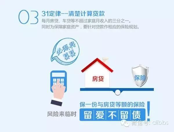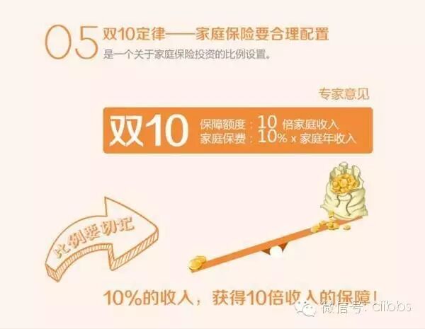 第1421期 | 编辑/保险论坛 14321定律:合理分配家庭财产 人们在长期的理财规划中总结出一个一般化的规则,就是所谓的“4321定律”,家庭比较合理的支出比例是:40%的收入用于买房或股票、基金等方面的投资,财富保值增值。也可适当配置理财类保险产品;30%用于家庭生活开支,保证基本生活;20%用于银行存款,以备不时之需;10%用于保险规划,管理人生风险。2墨菲定律:以防万一的准备 “墨菲定律”是一种心理学效应,意为“如果事情有变坏的可能,不管这种可能性有多小,它总会发生。”就如中国人喜欢说的一句俗语“天有不测风云”一样。事情如果有变坏的可能,不管这种可能性有多小,它总会发生。保险买的就是一个心安。虽然不能杜绝风险发生,但是能够在风险发生后用另一种形式防止家庭的二次伤害!331定律:有贷款更得有保险 31定律指的是每月的房贷还款数额以不超过家庭月总收入的三分之一为宜。一旦超过这个标准,家庭资产比例结构发生变化,面对突发状况的应变能力便有所下降,生活质量也会收到严重影响。所以为保障家庭资产,要针对贷款作相应的保险规划,保一份与房贷等额的保险,可有效转移面临重大变故时的贷款压力!480定律:风险投资多少看年龄 80定律就是:可投资数额=(80-你的年龄)*1%。比如以股票投资为例30岁时股票可占总资产50%,50岁时则占30%为宜。投资资产占比与年龄成反比,年龄越大,你投资的数额就减少点吧。因为随着年龄的增长,抗风险能力低,风险投资比例逐渐降低。保险作为长期的理财工具,所占比例应逐渐提高。5双十定律:家庭保险要合理配置 双十定律指的是“保险额度不要超过家庭收入的10倍”,以及“家庭总保费支出占家庭年收入10%为宜”。消费者可以通过“双十定律”的保险原则,对个人乃至整个家庭的保险规划进行科学、合理、有效的订制与评估。家庭保险‘双十定律’在实际运用中,上下浮动5%以内均为正常的区间。声明:公众号、第三方转载请注明“转自:保险自媒体联盟&保险论坛”,有违必究。 | |