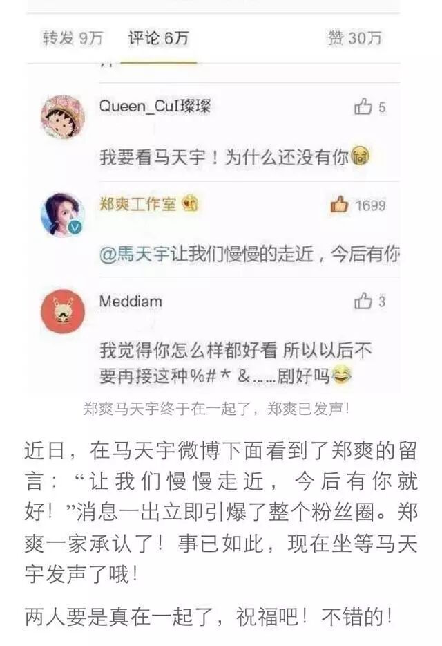 还记着当时羞涩的他们,惹得大家纷纷赞扬,小爽那时候还不少制片人,马天宇那时候,帅到了没朋友。 随后,二人深厚的友情就这么结下了基础,不管是出席怎样的场合,都笑脸相迎,窃窃私语,有着道不完的心声啊。 马天宇还在媒体上,公开为我们的爽妹子喊话,这也太暖心了吧,希望大家高抬贵手,好一个仁爱之心。 拍戏期间,二人的往来也从未停止,不是马天宇探班郑爽,就是郑爽前来探望马天宇,网友纷纷表示,友情不一般啊。 最近,马天宇的微博下,郑爽的一句话,更是把整个粉丝团都炸了,“让我们慢慢走近,今后有你就好...”纳尼?这是什么情况?小编都凌乱了。 不过没事的,我们的爽妹子开心就好,这样一个大帅哥,真要是在一起的话,粉丝们也是满满祝福的。 俊男美女,比起郑爽前几任的男友,小编觉得,我们的马天宇,实在是太有资格做她的男盆友啦 长按下方二维码关注 心灵祝福 满满心意满满情,天天祝福送不停 | |