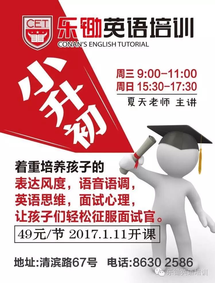 ?小升初课程,报名开始啦!? 乐锄英语小升初过渡课程,在巩固小学全部知识的同时,完美衔接初一内容,并着重培养孩子的听说读写能力,使其在各方面均衡成长。更培养孩子的表达风度,语音语调,英语思维,面试心理,让孩子们轻松征服面试官。 课程详情 夏天老师 1月11日 周三 9:00-11:00 周三 9:00--11:00 周日 15:30--17:30 清滨路67号 86302586 赠送假期人文知识免费课! | |