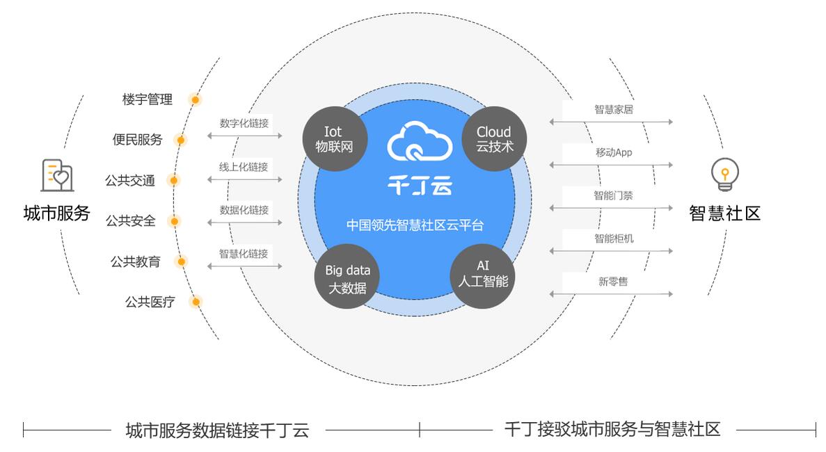 千丁互联智慧城市服务,是利用 I(IOT物联网)、C(Cloud云技术)、B(Big data大数据)、A(AI人工智能)等科技手段,助力城市管理实现数字化、线上化、数据化、智慧化。通过千丁云,实现社区与公共服务的无缝链接,使公共服务更好的触达社区居民,同时将社区居民的反馈同步给相关职能部门,从而形成智慧化的城市服务闭环。
