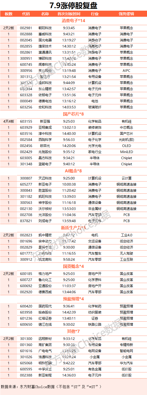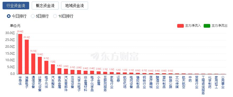 A股三大指数今日集体反弹,截止收盘,沪指涨1.26%,收报2959.37点;深证成指涨1.68%,收报8705.94点;创业板指涨1.43%,收报1652.12点。沪深两市今日成交额7245亿,较上个交易日放量1425亿。 行业板块多数收涨,消费电子与半导体板块大涨,电子元件、电子化学品、光学光电子、通信设备、计算机设备板块涨幅居前,农牧饲渔板块跌幅居前。 个股方面,上涨股票数量超过4200只。消费电子概念股集体爆发,德赛电池、国光电器、欧菲光、朝阳科技等近20股涨停。铜缆高速连接概念股再度大涨,胜蓝股份、神宇股份、凯旺科技、沃尔核材涨停。半导体板块震荡走强,蓝箭电子、晶方科技、闻泰科技涨停。CPO、PCB概念股午后大涨,中际旭创、胜宏科技、沪电股份均创历史新高。下跌方面,猪肉股陷入调整,巨星农牧逼近跌停。 ![]() 北向资金净流入141.11亿元 北向资金今日净买入141.11亿元,全天成交1256.53亿元,占A股总成交额的17.34%。中兴通讯、长江电力、工业富联分别获净买入7.39亿元、3.16亿元、2.79亿元;伊利股份净卖出额居首,金额为3.44亿元。 ![]() 行业资金流向:29.44亿净流入半导体 行业资金方面,截至收盘,半导体、消费电子、通信设备等净流入排名靠前,其中半导体净流入29.44亿。 ![]() 净流出方面,银行、化学制品、石油行业等净流出排名靠前,其中银行净流出5.52亿元。 ![]() 今日要闻 《程序化交易委托协议(示范文本)》征求意见 对券商和程序化交易投资者的权责范围作出约定 记者日前从业内独家获悉,为配合落实《证券市场程序化交易管理规定(试行)》的相关规定,指导券商更好地开展程序化交易,中证协组织起草了《程序化交易委托协议(示范文本)(征求意见稿)》(以下简称《示范文本(征求意见稿)》),于近日征求券商意见。据了解,《示范文本(征求意见稿)》正文共六章25条,主要包括释义、程序化交易报告、交易行为管理、高频交易管理、违约责任、附则等内容,对券商和程序化交易投资者的权利义务和责任范围作出约定。 北京自动驾驶迎来立法 明确支持这些活动场景!超14万亿元市场浮现 据报道,北京自动驾驶汽车上路将迎来立法保障。近日,北京市经信局就《北京市自动驾驶汽车条例(征求意见稿)》对外征求意见。在《征求意见稿》第二十条的创新活动场景中,明确表示支持自动驾驶汽车用于以下场景:城市公共电汽车客运、出租汽车客运(网约车)、汽车租赁等城市出行服务;除危险货物运输外的道路货物运输;摆渡接驳、环卫清扫、治安巡逻等城市运行保障;以及国家和本市支持开展的其他应用场景。 工信部:引导光伏企业减少单纯扩大产能的光伏制造项目 工信部对《光伏制造行业规范条件(2024年本)》《光伏制造行业规范公告管理办法(2024年本)》(征求意见稿)公开征求意见。《光伏制造行业规范条件(2024年本)》中提到,引导光伏企业减少单纯扩大产能的光伏制造项目,加强技术创新、提高产品质量、降低生产成本。新建和改扩建光伏制造项目,最低资本金比例为30%。 大增!首批券商业绩预告出炉!分析师看好1倍估值券商板块 红塔证券、东兴证券双双表示,今年上半年归属于母公司所有者净利润同比增长至少超过50%。首创证券则称至少增长60%以上。锦龙股份同日亦发来“喜报”,称控股子公司中山证券在今年上半年净利润实现扭亏为盈。受此影响,锦龙股份净利润亏损额较去年同期有所收窄。 机构观点 海通证券:基本面更优的中国优势制造或成股市中期主线 三中全会有望提振情绪,叠加基本面和资金面改善下半年市场中枢或上台阶,结构上关注高端制造。具体可关注具备出口竞争优势的中高端制造和引领新质生产力发展的科技制造。中高端制造方面,以汽车、家电、机械等行业为代表的中高端行业或是白马板块里面率先破局的重要主线。科技制造方面,细分领域中可关注以下领域:一是AI技术赋能推动复苏的消费电子。当前消费电子市场复苏趋势逐渐明显,23Q4/24Q1全球智能手机出货量同比增速均已转正。二是AI浪潮带动下周期回升的半导体。从产业周期看,全球半导体周期已处在明显回升趋势中。 中金公司:静待信心修复 虽然2月份以来的修复行情近期面临波折,但下半年稳增长政策加码结合当前资本市场政策红利下制度不断完善,以及即将召开的三中全会有望推进中长期改革,投资者信心有望回稳。配置方面,临近三中全会,改革关注度提升,部分领域如财税体制改革相关个股近期表现较为活跃;半年报业绩披露期,业绩好于市场预期的板块和个股有望有相对表现;景气提升结合政策支持,关注科技创新领域尤其是具备产业自主逻辑的板块;外需仍有韧性,在此背景下出口链行业和全球定价资源品有继续配置机会;红利资产近期虽有调整但中长期逻辑未变。 方正证券:预计乘用车公司业绩分化明显,板块整体同比有望增长 方正证券研报指出,2024年上半年以旧换新政策出台,叠加汽车市场价格战影响下,车市价格进一步下探,预计乘用车公司业绩分化明显,板块整体同比有望增长。自主乘用车龙头依托优异成本把控能力,预计业绩表现好于预期。出海方面,出口车企海外销量持续突破,在汽车出海大趋势下实现出口增量,海外盈利贡献突出有望部分抵减国内下滑部分,带动二季度业绩同比上行。华为系方面,AITO问界品牌系列新车/改款销量催化,以及高单车盈利能力带动